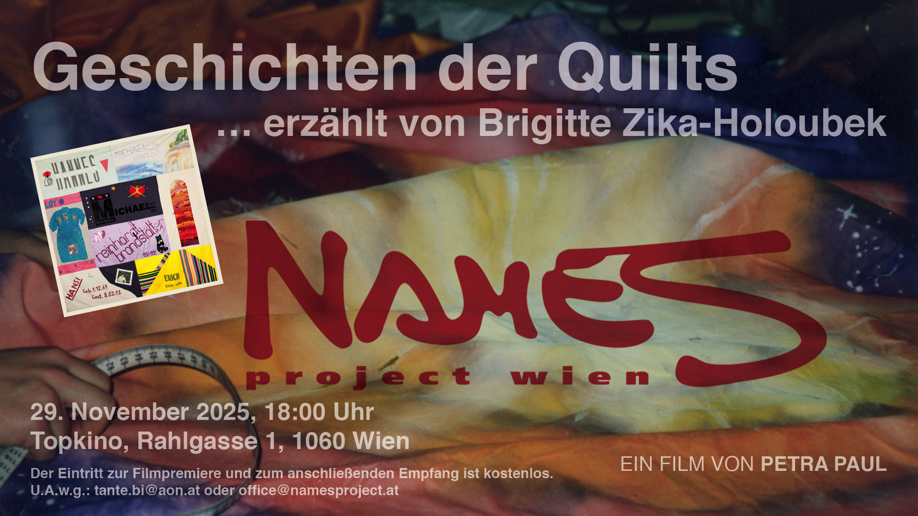 Musik Heidi Jaros: AIDS Memorial Day Ruzsa N. Lakatos und Familie: Nasvali sim, Mamo! (Ich bin krank, Mama!) Julius Zechner: The Long Goodbye Das NAMES Project Wien wurde 1992 von Friedl Nussbaumer und Brigitte Zika-Holoubek nach amerikanischem Vorbild gegründet und hat sich zur Aufgabe gestellt, Gedenktücher für Menschen herzustellen, die an den Folgen von AIDS gestorben sind. Die Idee, die Geschichten der Quilts filmisch festzuhalten, hatte Brigittes Partnerin Barbara Fröhlich. Für die filmische Umsetzung des No-Budget-Films konnte die multimediale Künstlerin Petra Paul gewonnen werden.